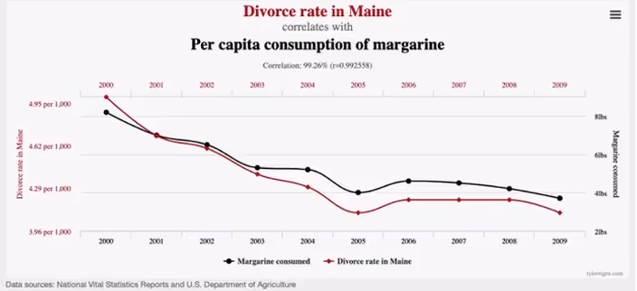 Der pro Kopf Konsum von Margarine und die Scheidungsrate im Bundestaat Maine korrelieren weitgehend. Die Aussage dazu ist: «Wer viel Margarine isst lässt sich häufiger scheiden.» Es dürfte uns allen klar sein, dass diese Aussage völlig schwachsinnig ist. Es macht einfach keinen Sinn, dass Margarine und Scheidungen in einem Zusammenhang stehen. In diesem Fall ist es offensichtlich, dass zwischen den beiden Tatbeständen keine Kausalität besteht.